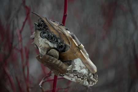 Имитация черепа с элементами из натуральной кожи и кольчуги. Искусственно состарен для придания нужного эффекта. Длина 13см.